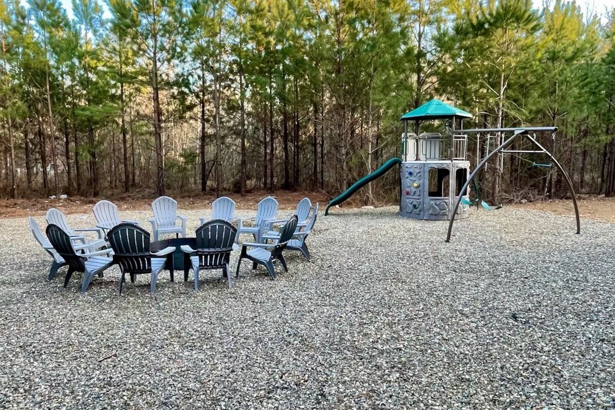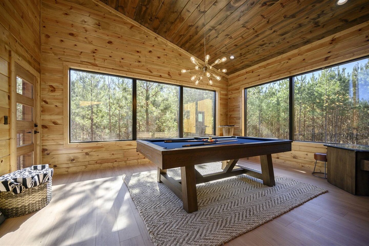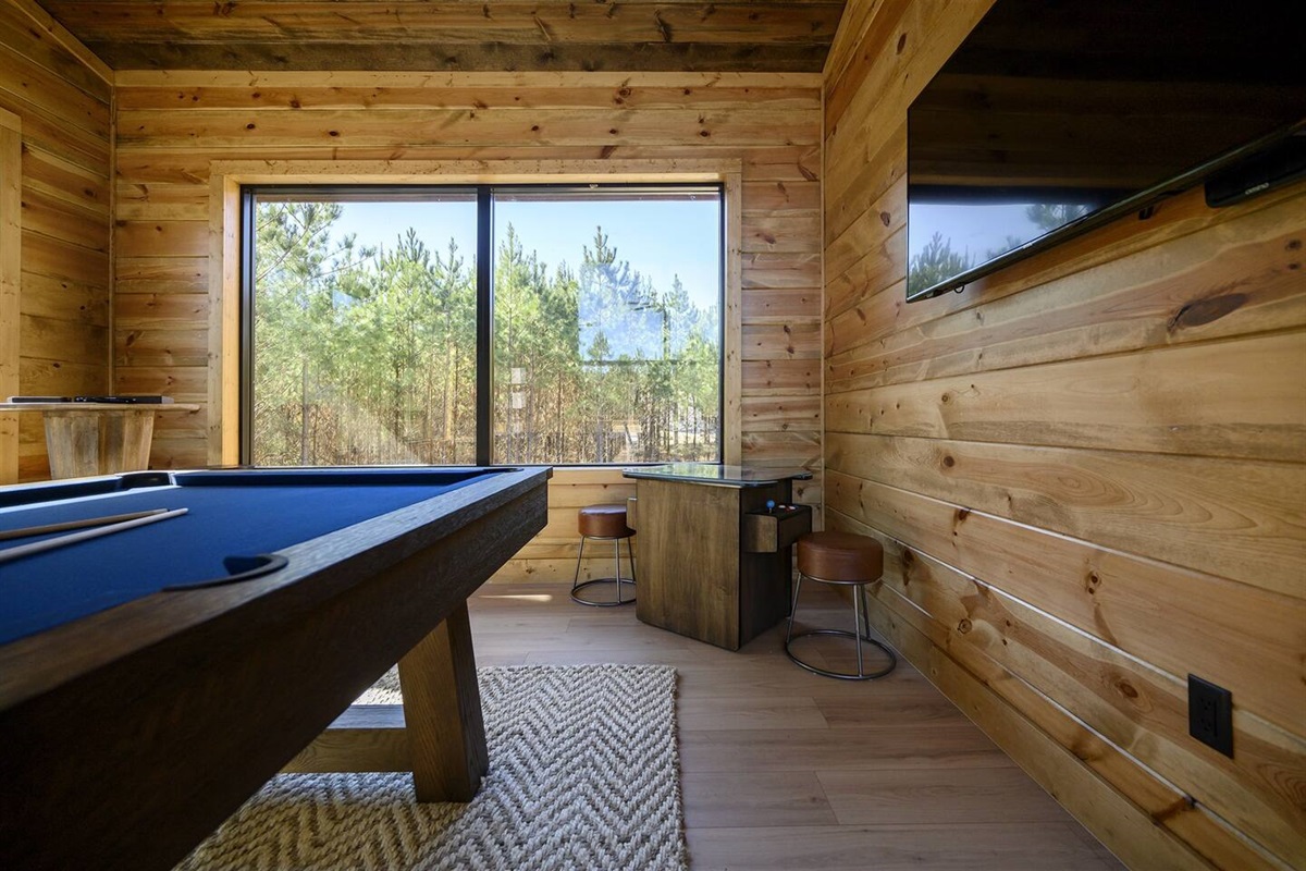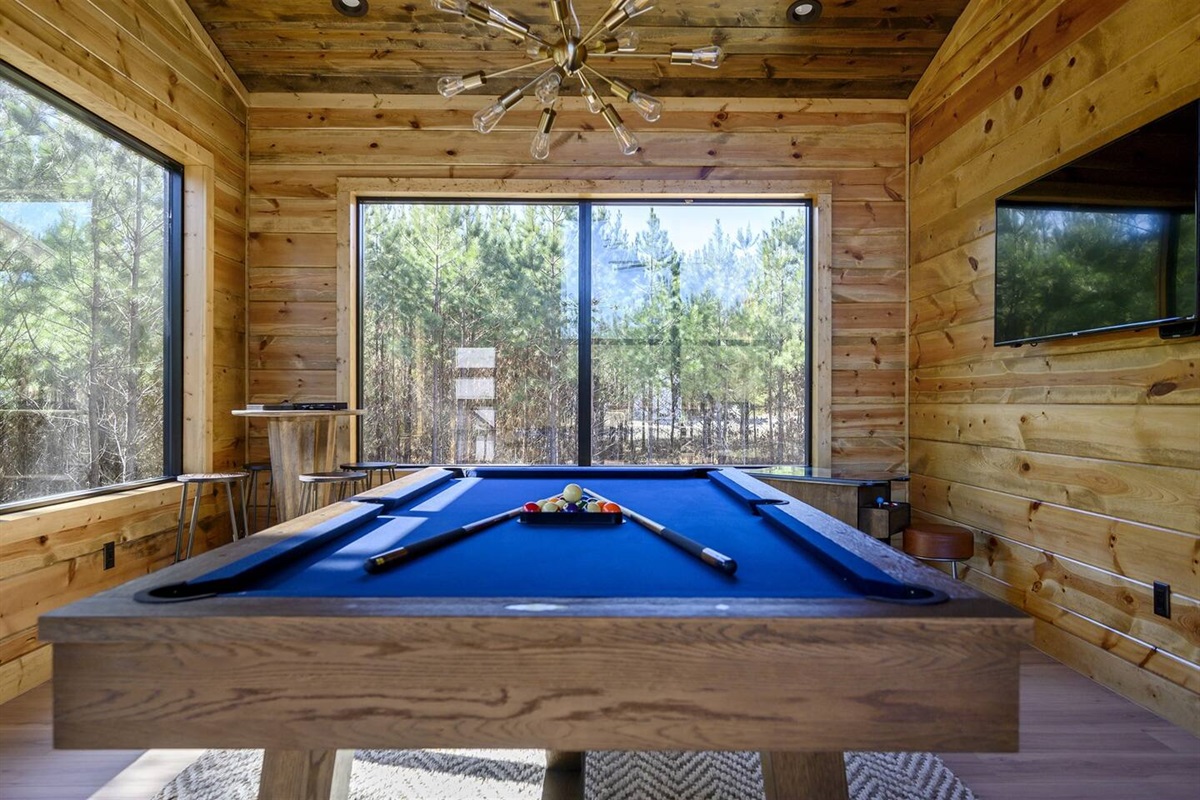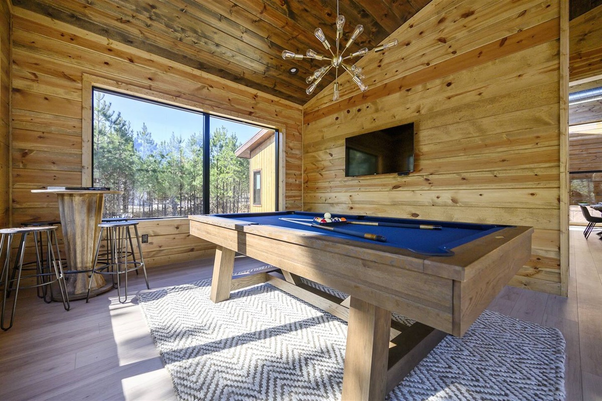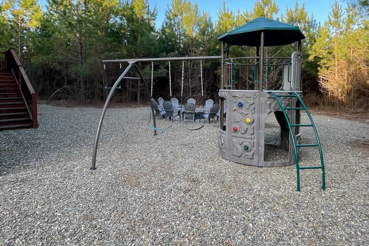 Off the living room is a large game room full of windows! Entertainment options abound with a pool table, arcade game, and a covered patio equipped with a hot tub and outdoor TV. The firepit is the perfect spot for s'mores, surrounded by ample seating for your entire group PLUS we have a playground for all the kiddos!