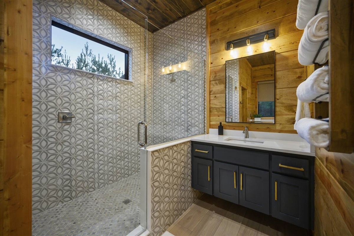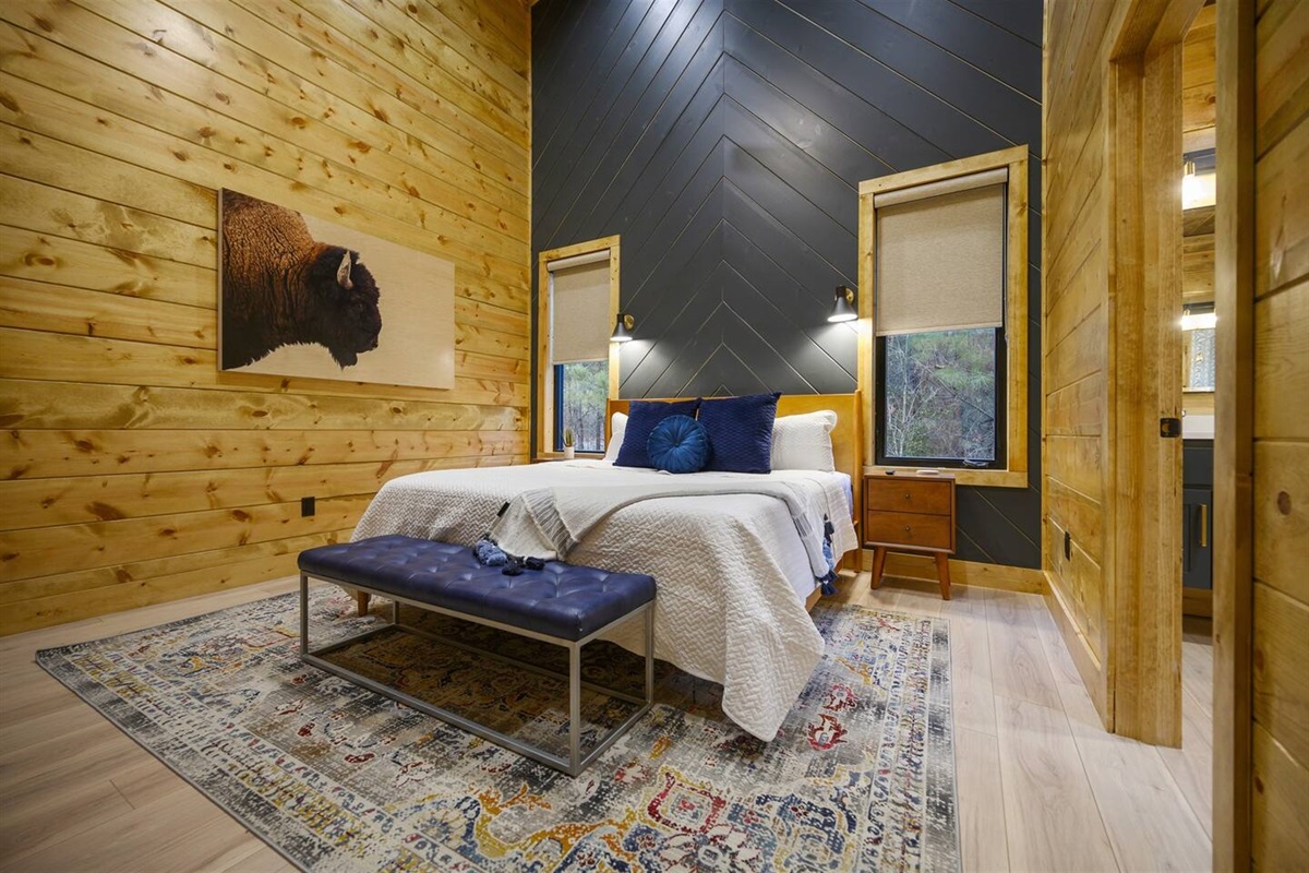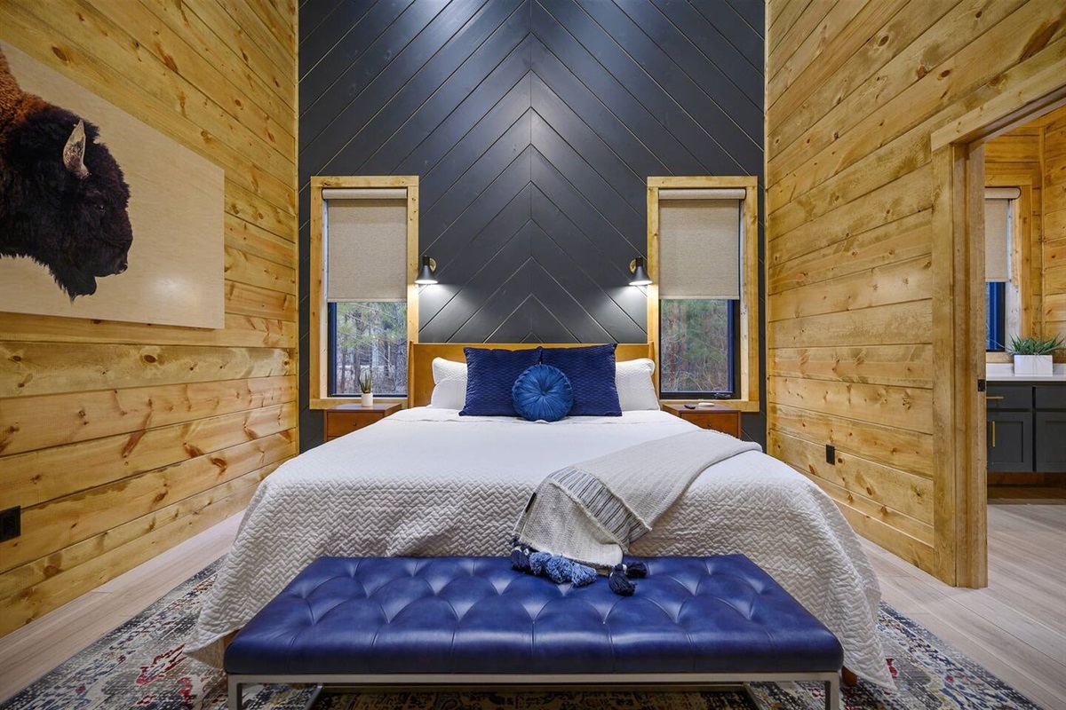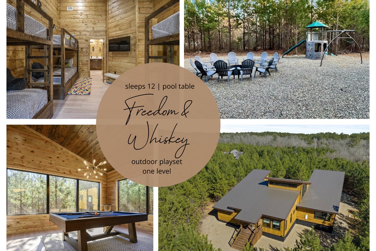 Welcome to Freedom and Whiskey, your ultimate cabin retreat in Broken Bow, Oklahoma! This stunning one-level cabin, presented by The Bear Cabins, offers an unforgettable experience for families and friends. With three king en-suites and a bunk room, everyone enjoys privacy and comfort.