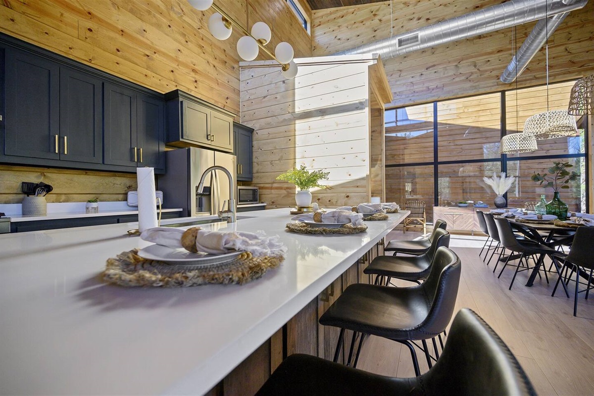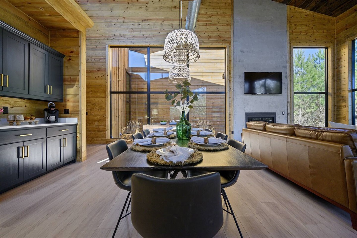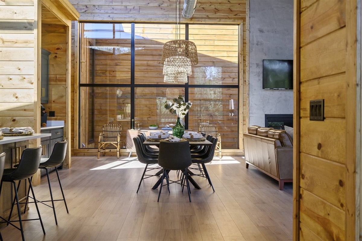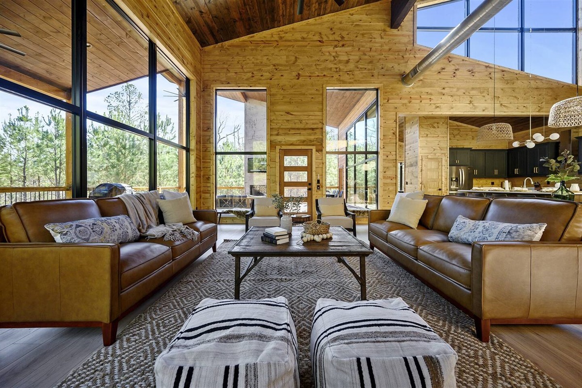 As you step into the main living area, you'll be captivated by the breathtaking views of pine trees through floor-to-ceiling glass windows. Enjoy 180 degrees of pure nature and tranquility. Positioned at the end of the road, the cabin offers unparalleled privacy, with only the gentle breeze through the trees. The cabin's open concept kitchen, living, and dining area is perfect for group gatherings, featuring 30-foot floor-to-ceiling windows that provide breathtaking views of the surrounding pine trees.