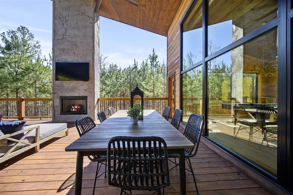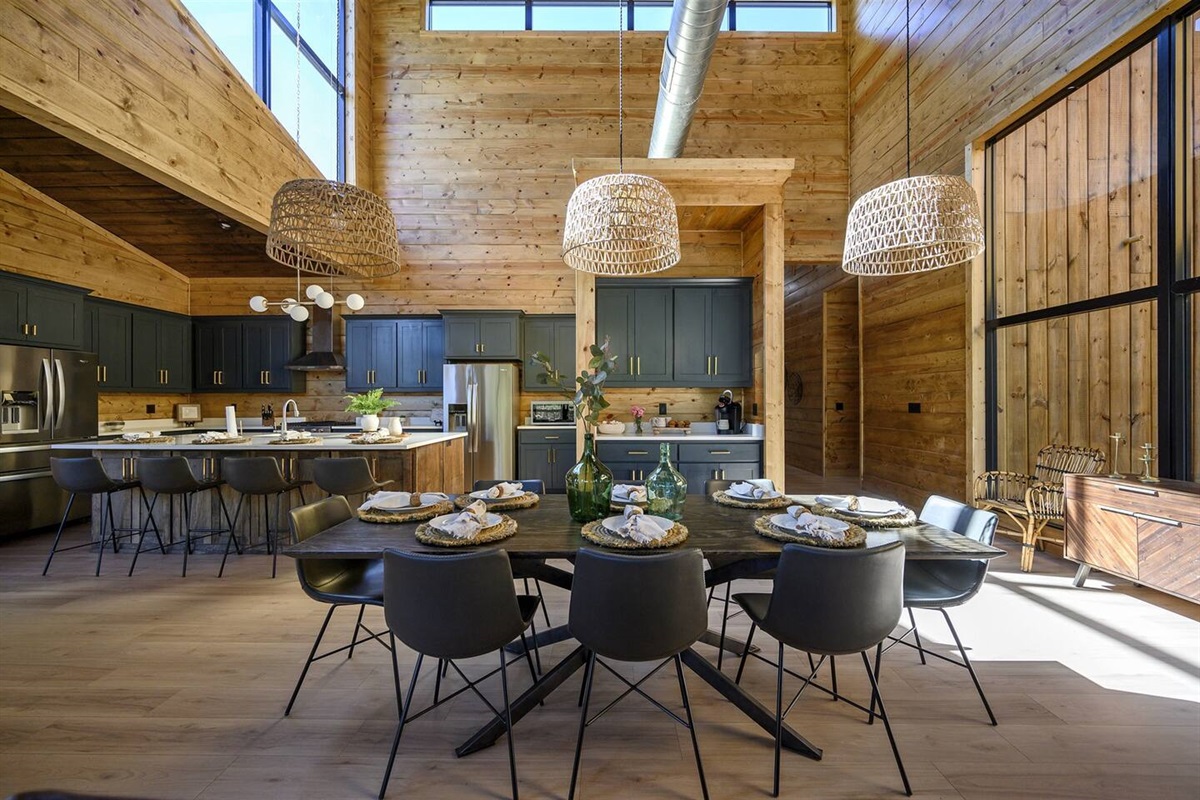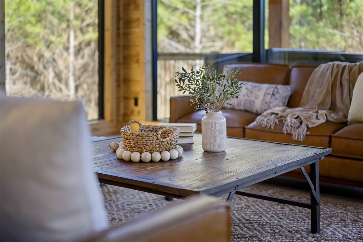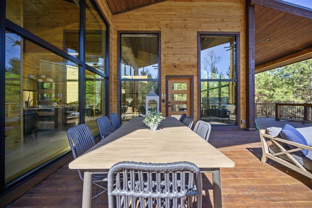 As you step into the main living area, you'll be captivated by the breathtaking views of pine trees through floor-to-ceiling glass windows. Enjoy 180 degrees of pure nature and tranquility. Positioned at the end of the road, the cabin offers unparalleled privacy, with only the gentle breeze through the trees. The cabin's open concept kitchen, living, and dining area is perfect for group gatherings, featuring 30-foot floor-to-ceiling windows that provide breathtaking views of the surrounding pine trees.